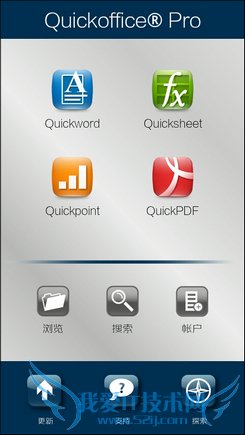 Quickoffice Pro的初始界面全部采用图标排列方式,界面除标题栏之外,其余全部为设计精美的图标按钮,直观而且便于点触选择。