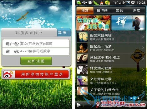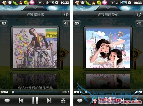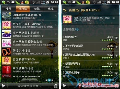 与Andriod平台其它的手机音乐播放器比较而言,多米音乐在UI设计上绝对是最好的,没有之一。不可否认,像天天动听、QQ音乐等,在UI设计上做的也非常不错,但相对于多米音乐而言就少了一分灵动。多米音乐清新灵动的界面设计,是其大受欢迎非常重要的原因之一。