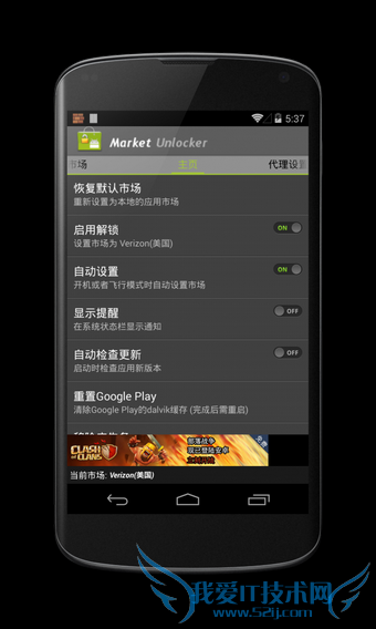 对于这款应用,相信笔者也无需多言了,它可以动态模拟手机的运营商代码,从而查看市场里的付费应用,需要手机有root权限。启动“市场解锁”,将“启用解锁”和“自动设置”选项打开。对了,即便你已成功切换为美区账号,无需任何工具都能访问完整版 Google Play ,也要做这个步骤哦!