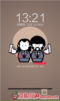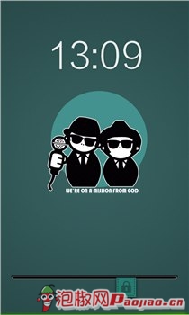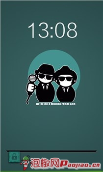 这是一款非常新潮的锁屏界面。非常类似iPhone手机的靓丽锁屏主题。锁屏界面的上端是时间,中间是两个很酷的黑衣人。解锁方式是横向拉动的方式。