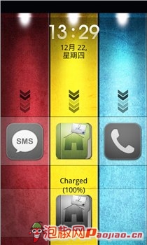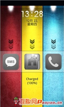 这又是一款既靓丽,又具有个性的安卓手机锁屏主题。整个界面由红黄蓝三原色组成。用户只要向下拉动短信、桌面或者电话按钮中的其中一个就能解锁手机。锁屏界面显示有时间日期,以及电量百分比,非常的不错。