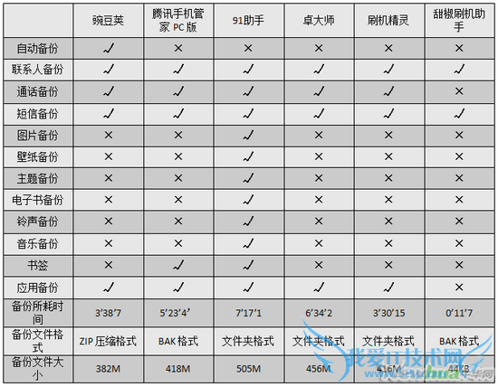 目前,大部分的手机管理工具基本上都拥有数据备份功能,只是在备份的项目以及速率上稍有不同,而其中我们比较常用的大都是这么几款:豌豆荚,腾讯手机管家PC版,91助手以及卓大师等一系列的刷机工具,下面我们就来对比下他们之间关于数据备份的参数: