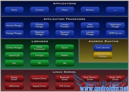 目前Android 的 Linux kernel控制包括安全(Security),存储器管理(Memory Managemeat),程序管理(Process Management),网络堆栈(Network Stack),驱动程序模型(Driver Model)等。