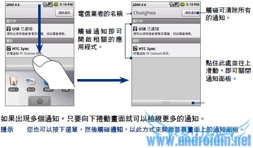 当状态列出现新的通知图示时,请点住状态列,然后向下滑动手指,即可开启通知面板。