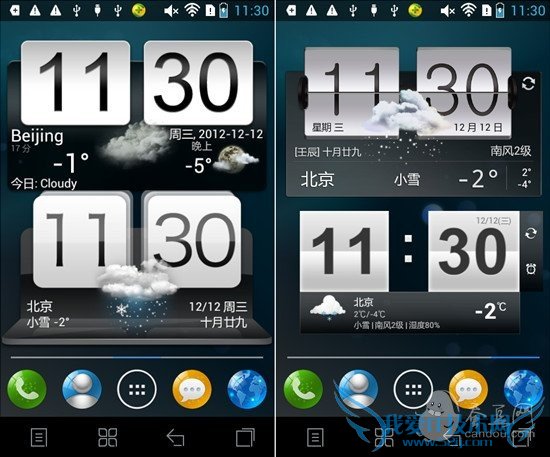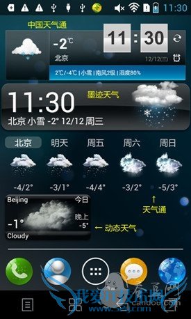 从这几种默认窗格的显示来讲,《中国天气通》的信息依然最全,不过时间和天气信息的字号比例实在是有待改进。《天气通》增加了刷新按钮,默认显示一天预报。《动态天气》增加了时间显示,《墨迹天气》的显示内容则和4x1的窗格没有太大区别。