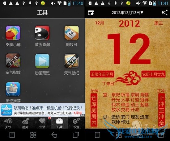 《墨迹天气》的工具栏里有更换皮肤、黄历、倒数日和天气动画预览等功能,其中的黄历查询功能在现在的应用中可是不多见的,然而在现实中依然有很多人保留着“出门看黄历”的传统习惯。此外,《墨迹天气》还有“时景天气”功能,用户可以随时拍摄自己周边的天气状况,并上传到软件上与大家分享。