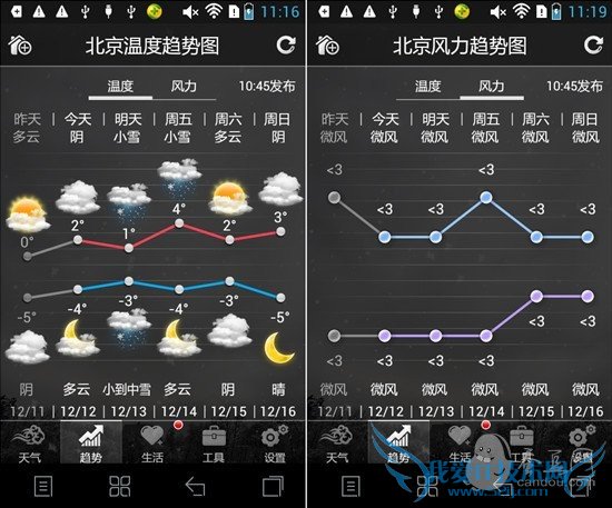 说完了实时天气,让我们再来对比一下四款软件天气预报的功能。虽然小编在前面说过,大多数的天气软件的信息都来自于气象台,但是每款软件预报的天数和细节情况,还是值得比较一下的。