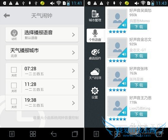 《天气通》的一个重要宣传点就是他们的语音播报功能。用户可以设置时间来让软件自动播放天气预报,就像收听收音机一样。而且他们还邀请了七位中国好声音的学员来为您播报天气,是不是很有吸引力呢?