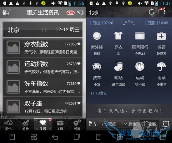 《天气通》则提供了8种生活提示和当天的日出、日落时间,点击各个图标会相应地弹出更加详细的提示信息,这个点击动作和《墨迹天气》是一样的,但是起码《天气通》没有烦人的广告。