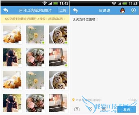 除了支持GIF动态说说制作外,手机相册还支持多图上传,让拍照狂人们尽情上传分享照片。目前,手机QQ空间2.4已经支持一次上传5张照片,而且上传速度大幅提升。此外,写说说的时候还支持添加位置信息,无论旅游还是出差,不妨发图片说说的同时也加上位置信息,让空间好友随时分享你的现场,是不是有种满足感?