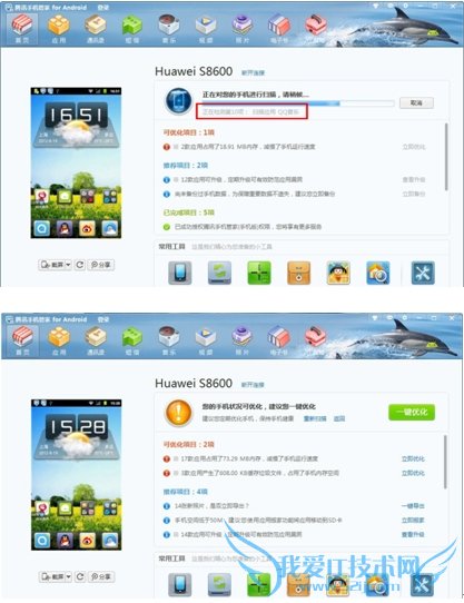 扫描完成后,将向用户详细展示扫描结果,一切可优化项目、推荐优化项目将分别展示在用户眼前。当手机需要优化时,将告知“您的手机状况可优化,建议您一键优化”。