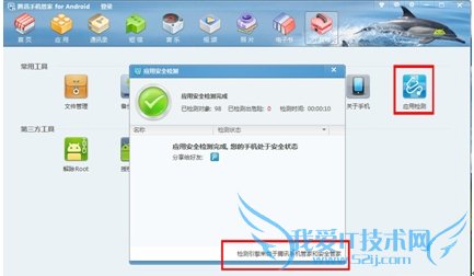 此外,在腾讯手机管家PC版工具箱中,用户还可以找到“应用检测”工具。该工具的检测引擎来自于腾讯手机管家和安全管家,通过双重的云端病毒库安全检测保障,避免用户手机遭受手机病毒等不安全因素带来的损失。