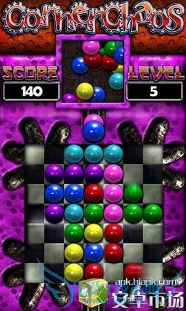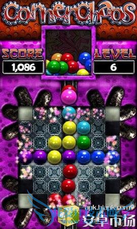一款有趣而且玩法特别的消除类游戏。和同类游戏相比,游戏的风格与众不同。本作的游戏创意在于彩球的移动规律,需要你统筹安排彩球的码放,考验了玩家对整个布局的计算和感觉。在游戏的画面中,你首先看到的是一个7X7的的黑白棋盘,这个就是游戏进行的地方,然后,你在四个角落会看到每一个角落有4个通道(共16个通道)。这些通过可以放出彩球,放置后彩球会自动滚落到中间的“十”字形凹槽中,拐弯聚集到中间区域,凑齐4个相同颜色的相邻球便会消除,要赢取更多的空间进行摆放。