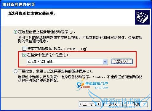 接着通过“浏览”找到下载好的驱动所在的文件夹(这里以Windows XP系统x86芯片为例)。