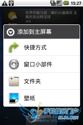在屏幕空白的位置长按(也可以按MENU键选择添加),机器会震动一下然后弹出对话框添加,选择窗口小部件,然后选择想要添加的部件,就能够把该部件添加到屏幕,当然必须保证屏幕有足够的空间哦。