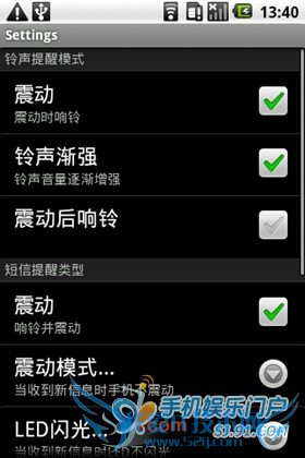 在界面中点击高级设置,可以进行震动、LED闪光、铃声坚强、短信是否弹出显示等多项个性化功能,足够满足日常需求。