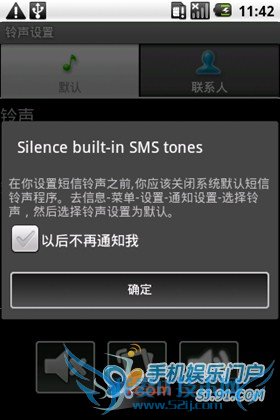 运行软件后,我们会发现主界面分为默认和联系人两个标签,默认标签下可以设置基本的铃声和短信铃声,点击下拉框,首次运行可能会有确认提示,直接点确认跳过。