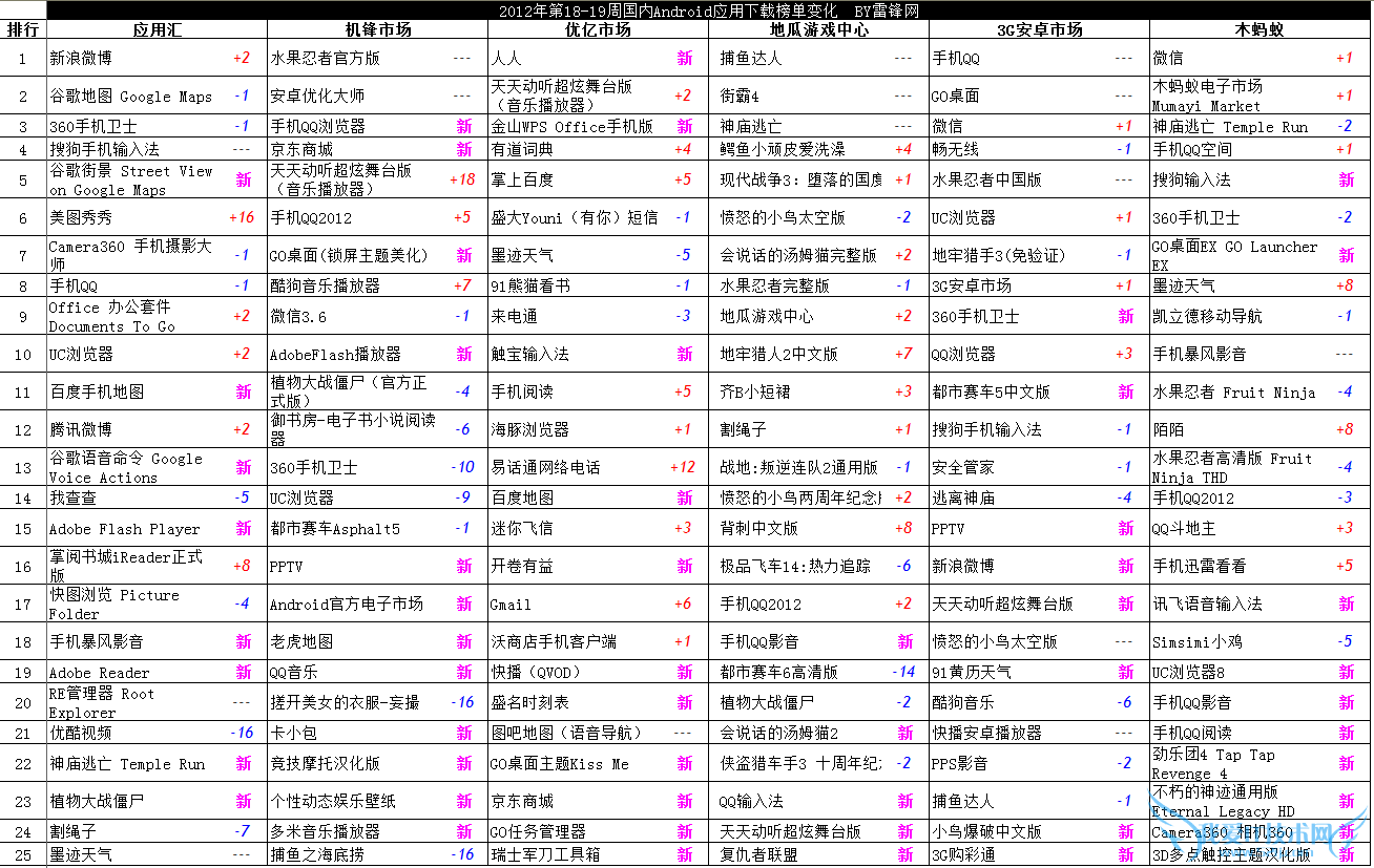2012年第19周国内 Android应用下载应用榜共包含安卓市场在内的十二家第三方应用商店数据,榜单总结如下:机锋更新最多,91更新最少;3Q大战QQ的优势在变少;音乐及地图类应用最近发展较好;Android的云笔记市场不受Evernote热潮影响,各种平淡。