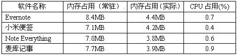 从中可以看出,无论是内存占用还是CPU占用方面,小米便签和Note Everything都相对占优势,而小米便签CPU占用最少,Note Everything内存占用最少,而Evernote内存占用最多,麦库记事搜索笔记时,可预览笔记文本内容,设置启动和修改时自动同步。