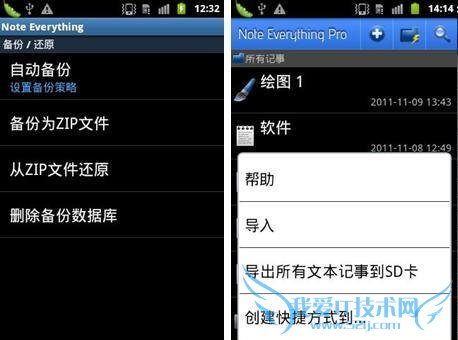 在文件安全上,Note Everything支持单个记事文件加密操作,还支持对所有文件数据备份为ZIP文件或自动备份,导出数据至SD卡,也支持从ZIP文件或SD卡中还原。为方便用户操作,Note Everything还支持创建多种不同记事形式的快捷方式。