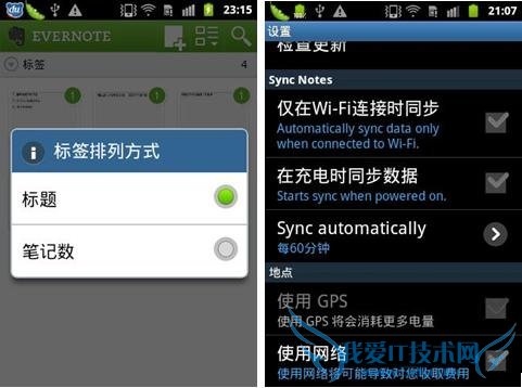 Evernote还提供了标签管理和笔记同步功能,在标签管理页面可设置标签按照标题或笔记数排列;同步功能,可以设置在WiFi网络或充电时同步,也可以设置自动同步时间。