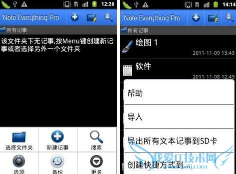 3、Note Everything运行软件后,进入记事列表页面,上方有新建记事、选择文件夹和搜索等功能按钮。菜单功能同样丰富,除新建记事、搜索外,还有备份、导入、导出等功能。