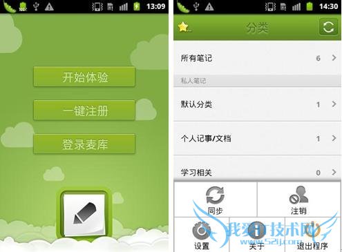 4、麦库记事界面比较精美,具有帐号注册、登录功能,但不登录也可以体验软件功能。开始体验后即可进入笔记分类页面,菜单具有同步、注销、设置等功能,相对简单。