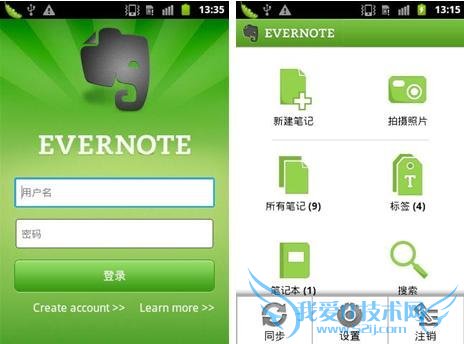 1、Evernote软件界面比较清爽,需要注册帐号登录后才可使用功能,图标布局比较协调。菜单功能简单,只包含同步、设置和注销等功能。