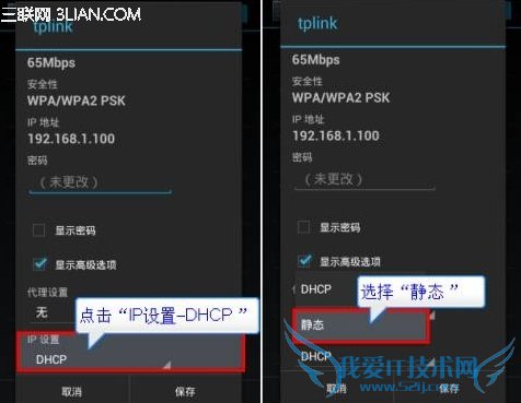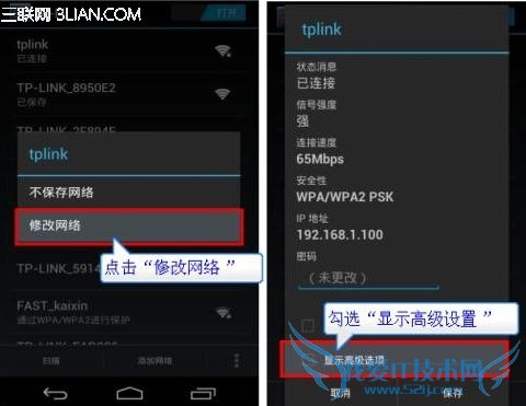 当无线终端的IP地址参数配置不正确,即使成功连接无线网络也无法上网,可修改无线设备的网络参数。长按对应无线路由器信号名称,选择修改网络,勾选显示高级选项。如下图示: