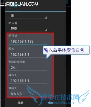 设置静态IP地址等参数,注意输入好的字体会变成白色。点保存。如下图示: