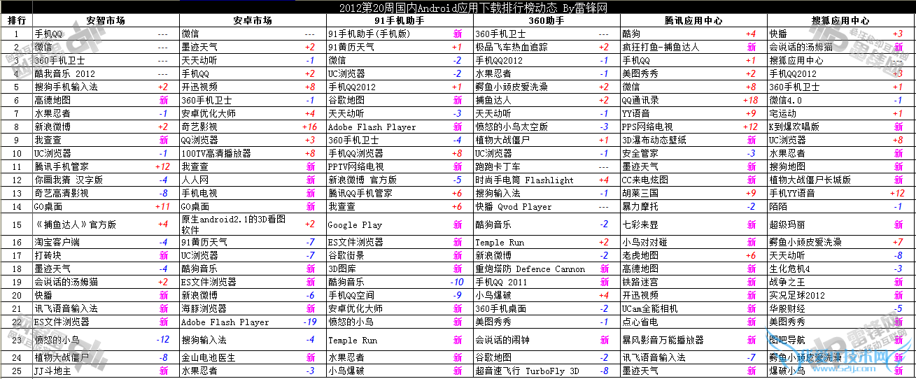 2012年第20周国内Android应用下载应用榜共包含安卓市场在内的十二家第三方应用商店数据,榜单总结如下:应用汇和木蚂蚁更新最多,360创新低;微信羽翼渐丰,超越QQ有望;墨迹天气本周成绩傲人;高清水果消失,中国水果上位;不会飞的小鸟才是最永恒的主题。