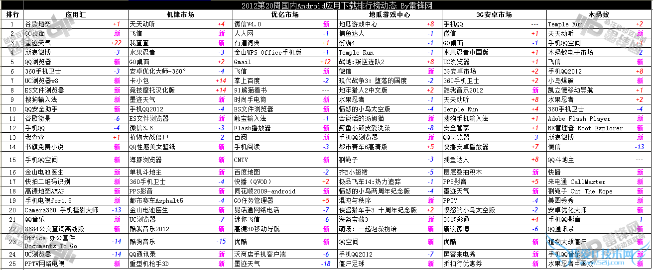 由于360助手榜单缺席,本周榜单共包含安卓市场在内的11家第三方应用商店数据,榜单总结如下:腾讯应用新应用最多;微信和QQ差距渐小,不过要小心飞信得利;墨迹成绩下滑,出现中国特色对手;WPS超越OFFICE;小鸟在爆炸之后还是消逝了。