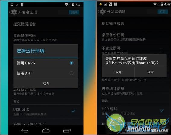 进入到开发者模式,然后选择运行环境即可。安卓4.4系统中依旧拥有传统的Dalvik模式以及新增的ART模式。我们选择切换到ART模式即可,选择切换后,系统后重新启动。这主要由于改变了系统原有的运行环境,需要等到程序优化完毕即可。