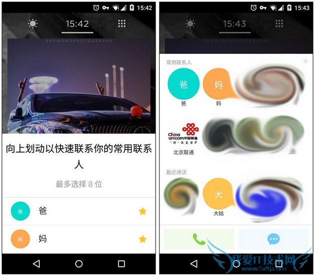 这个桌面还有一个非常方便的功能,即为在主屏幕的应用图标上向上滑动,即可打开常用联系人界面,下方还带有通话和信息图标,所以不用在屏幕上放置拨号于SMS应用亦可进行这些操作。