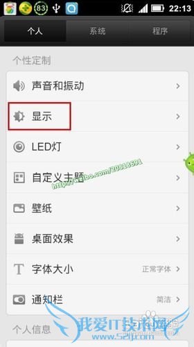 按下defy手机下方的menu键,进入“系统设置”,在出现的新界面中切换到“个人”选项卡,然后点击其下的“显示”按钮。