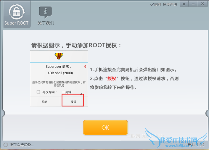另外,当手机界面出现Superuser请求时,点击“授权”按钮,手动添加HTC one 802w root权限!