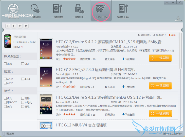 除此之外,你还可以直接点击主页面上方“rom市场”按钮,搜索中意的HTC G12刷机rom下载进行刷机。