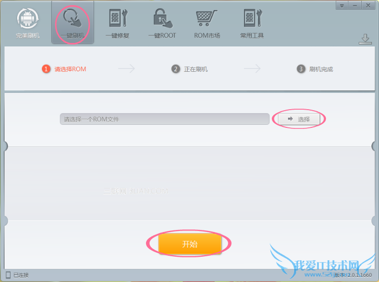 启动刷机软件,确认软件与手机成功连接后再继续操作。