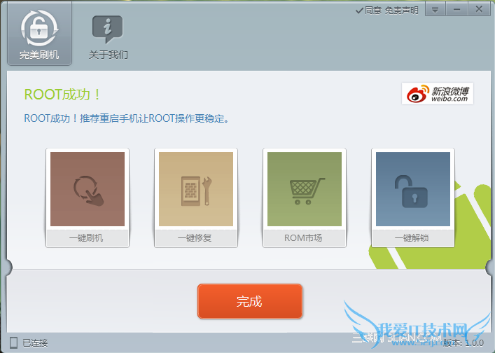 完美ROOT软件页面如下图所示,软件完成HTC g12一键root工作,请点击“完成”。手机重启成功表示HTC g12 获取root权限过程结束,同时应用程序列表会出现一个SuperSU的图标。