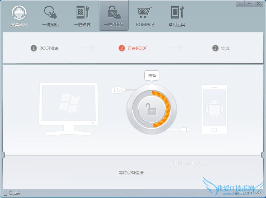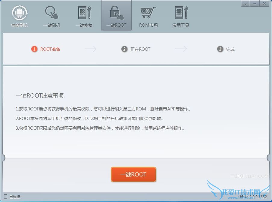 一,获得权限后可以刷入第三方Rom,删除自带App等等操作内容,二,获取权限的手机,售后服务会受到影响。确认后点击一键Root按钮。