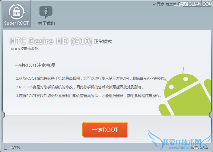 完成HTC g10 root准备工作后,双击软件图标启动软件,软件成功连接手机后进入HTC g10一键root页面,这时需要机友们认真阅读页面的操作注意事项,阅读完毕点击“一键ROOT”选项,软件马上开始运行HTC g10获取root!