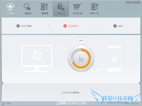 阅读完页面注意事项后,点击“一键root”,软件立即运行HTC g14一键root!