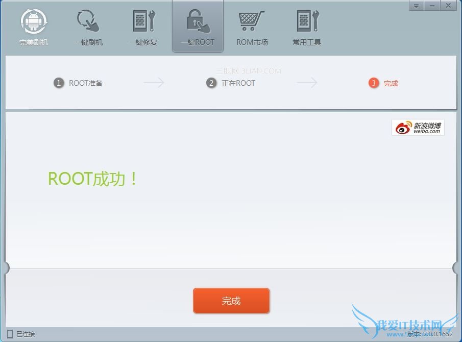 软件显示成功则表示Root步骤已完成。此时完成按钮也由先前的灰色变为可点击的绿色。鼠标点击完成按钮,关闭软件。