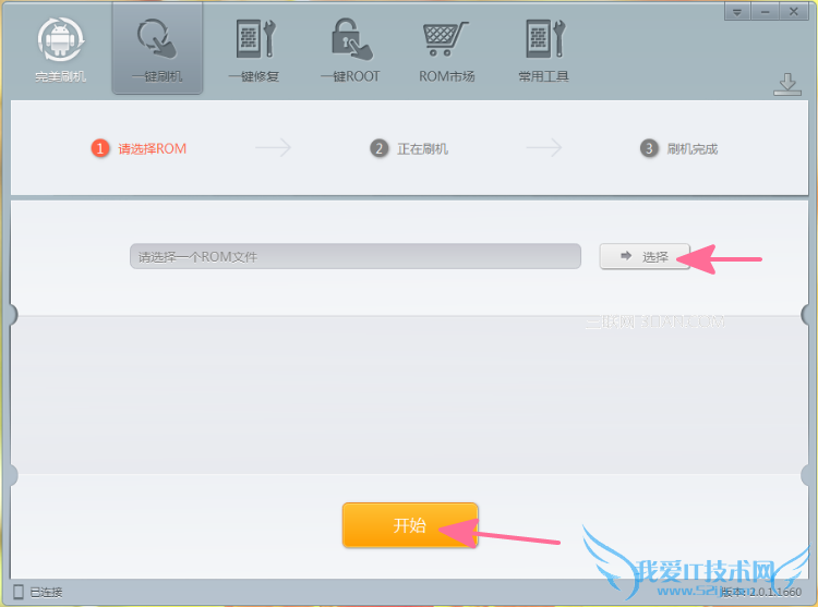 途径二:如果刷机之前你就已经准备好HTC g17刷机包,请直接切换至“一键刷机”页面,点击“选择”,选定你已经准备好的rom包,点击页面下方的“打开”即可完成导入rom包的操作。将rom添加到主页面的选项框后,点击“开始”HTC g17刷机软件立即运行。