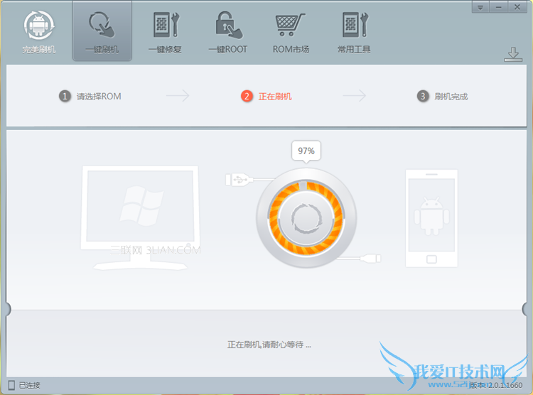 HTC g17自动刷机过程正式开始,这是HTC g17刷机教程关键步骤,刷机软件运行需要5—10分钟,在这段时间里不要对手机进行任何额外操作,比如移动和触碰!
