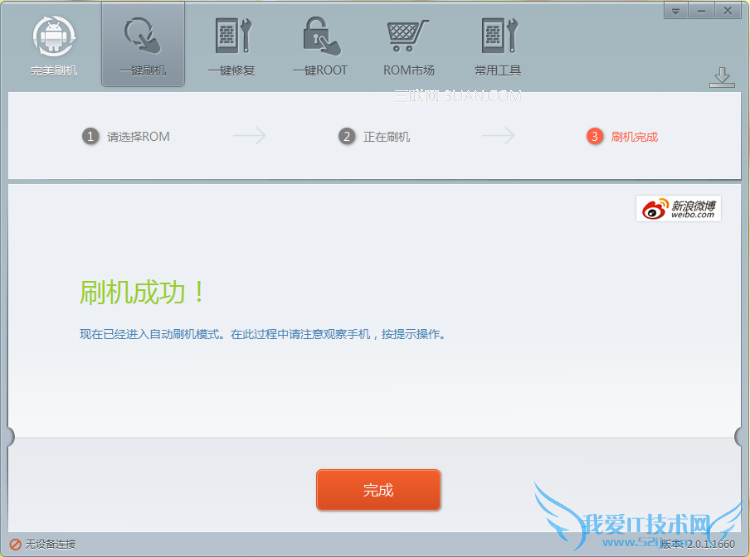 HTC g17刷机软件工具条向前推进到“刷机完成”,点击“完成”即可,等待手机自动重启,重启成功标志HTC g17刷机过程全部结束,耐心等待!