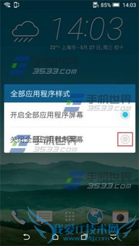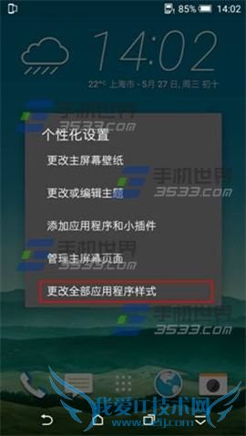 1)在HTC One M9+待机界面中点击空白处不放,选择【更改全部应用程序样式】。(如下图)