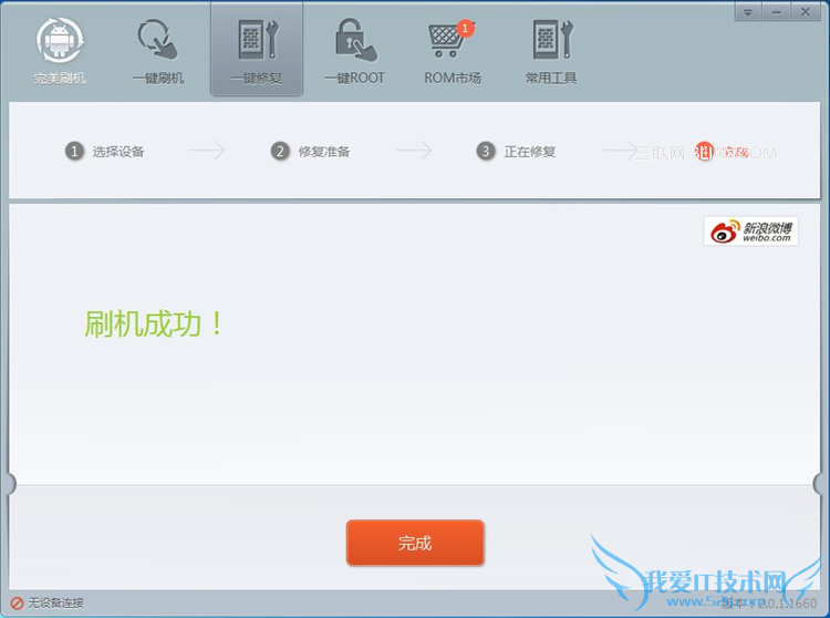 修复工具条运行到“完成”位置,软件弹出页面提示你HTC one V变砖修复工作接近尾声,点击“完成”,然后等待手机自动重启!开机成功说明HTC one V救砖完成!