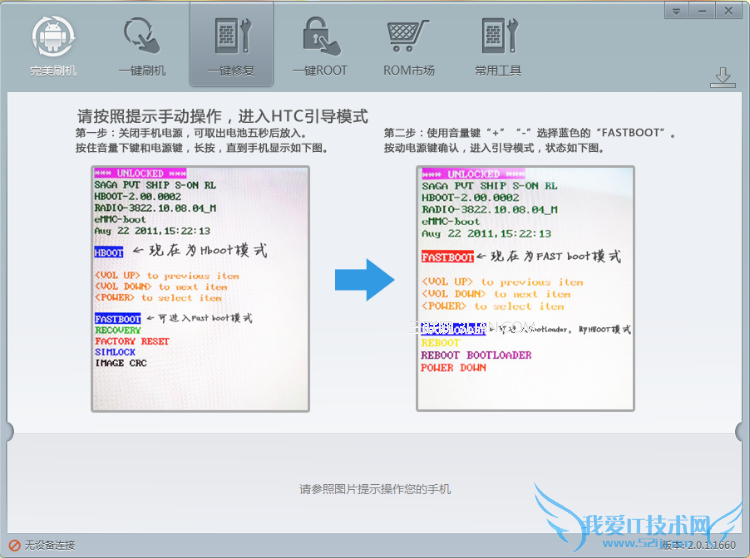 确认HTC one V救砖后,弹出进入引导模式的指导页面,具体步骤参照下面的软件截图!