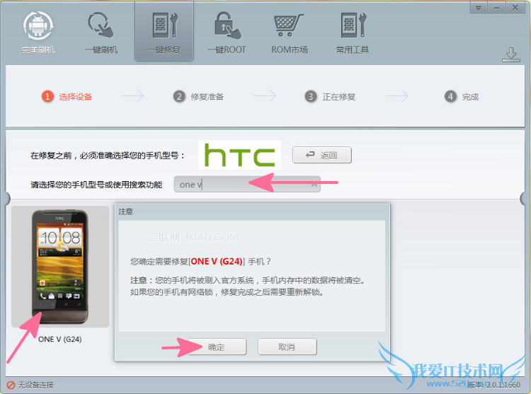 点击救砖页面“HTC”图标,进入HTC救砖页面,出现HTC各个机型,在搜索框里输入手机型号,如“one v”,点击搜索到的“one v(G24)”图标。点选机型后,页面弹出一个对话框,确认是否要进行HTC one v救砖,选择“确定”。